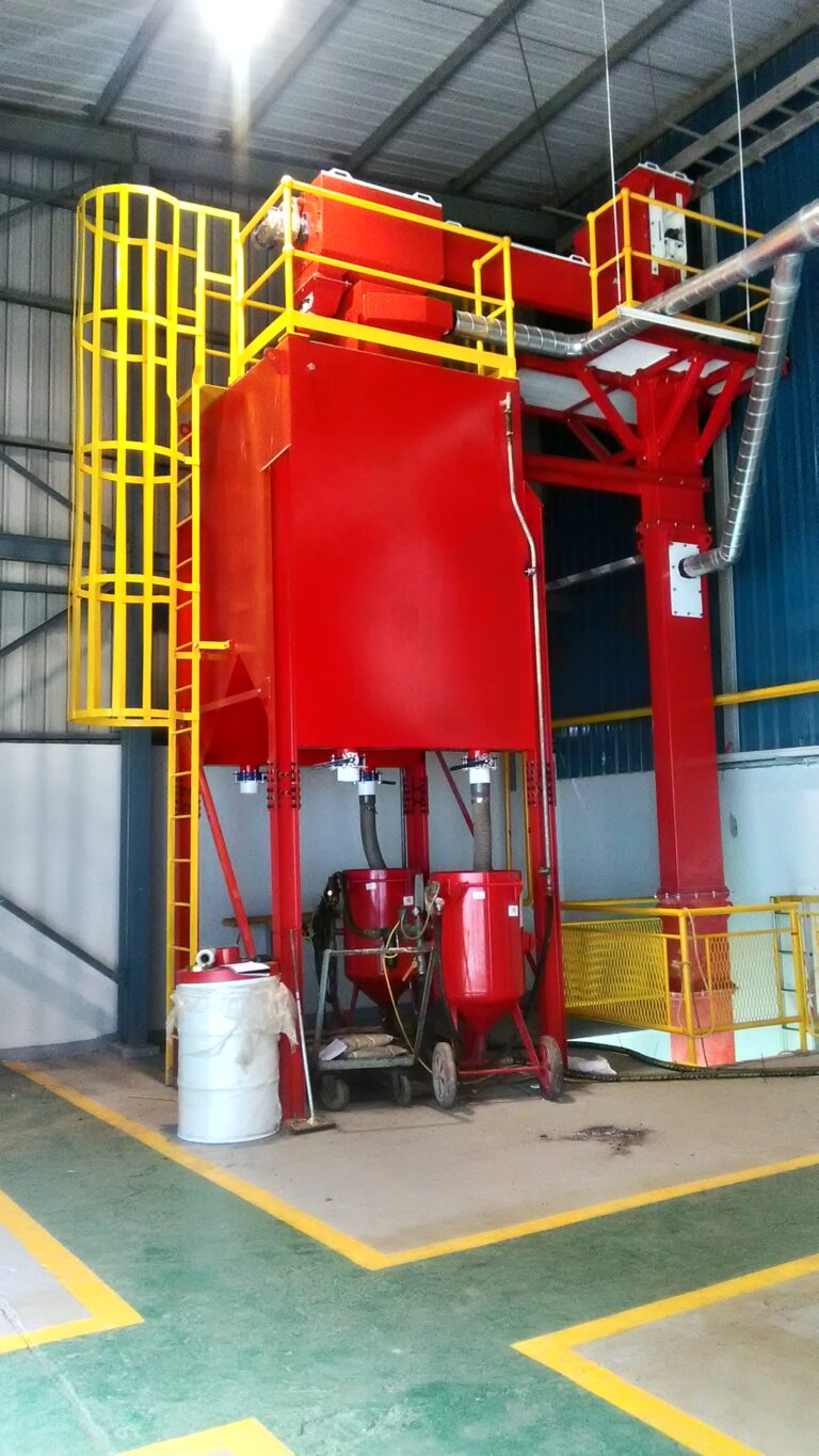 > Abrasive storage hopper with 10/20 tonne steel grit capacity and butterfly outlets for 4 blast pots.