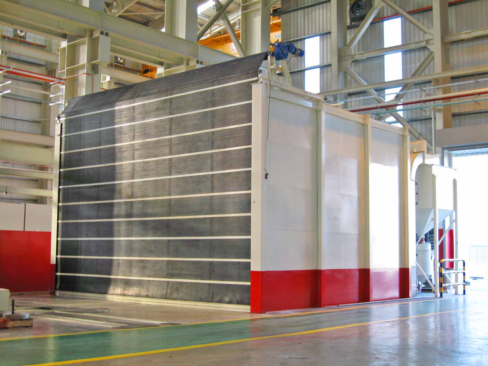Formed side guides track the door up and down and provide dust free sealing during blasting.